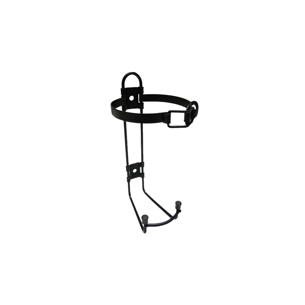 Suporte de Extintor Veicular cor preto para PQS 2 KG, modelo Convencional. Modelo Reforçado: Com hastes laterais para reforço.